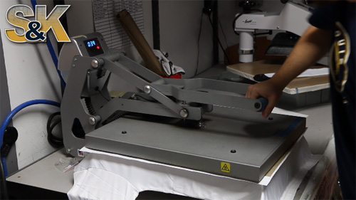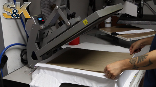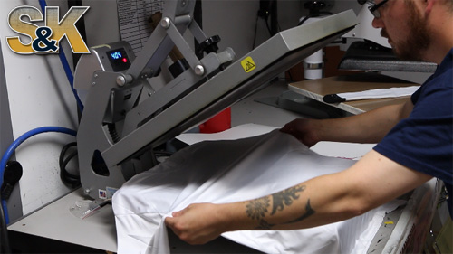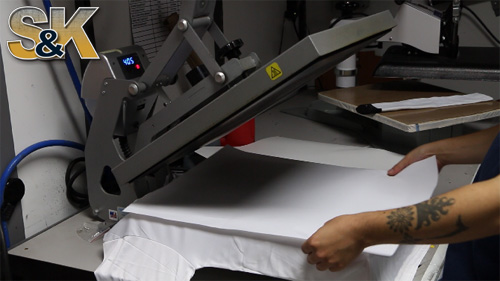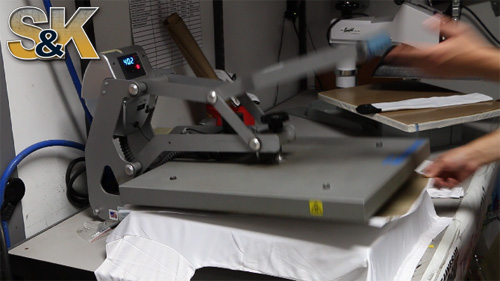 After you have received your Dye Sublimation Paper from S&K you will need to prepare your shirt ( or other item ) on your heat press. Please ensure that you have most of the large wrinkles out as they can cause creases in the fabric that can result in some areas of the item to be blank.